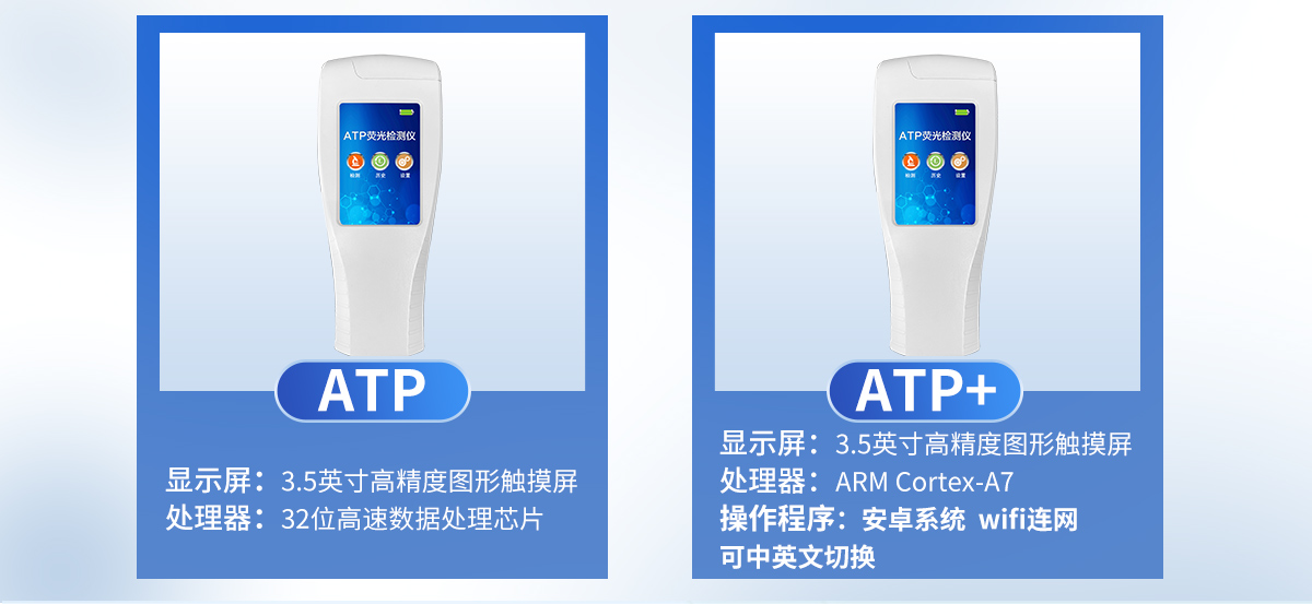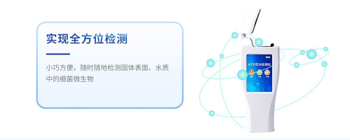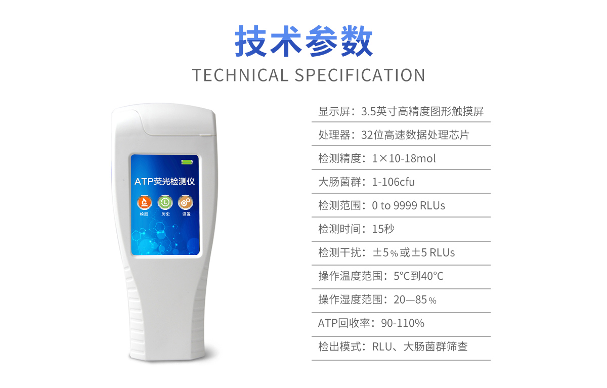 該設(shè)備為全新升級產(chǎn)品,大屏幕觸摸顯示屏,代替?zhèn)鹘y(tǒng)按鍵。操作采用生物化學(xué)反應(yīng)方法檢測ATP含量,ATP熒光檢測儀基于螢火蟲發(fā)光原理,利用“熒光素酶—熒光素體系”快速檢測三磷酸腺苷(ATP)。ATP拭子含有可以裂解細(xì)胞膜的試劑,能將細(xì)胞內(nèi)ATP釋放出來,與試劑中含有的特異性酶發(fā)生反應(yīng),產(chǎn)生光,再用熒光照度計(jì)檢測發(fā)光值,微生物的數(shù)量與發(fā)光值成正比,由于所有生物活細(xì)胞中含有恒量的ATP,所以ATP含量可以清晰地表明樣品中微生物與其他生物殘余的多少,用于判斷衛(wèi)生狀況。