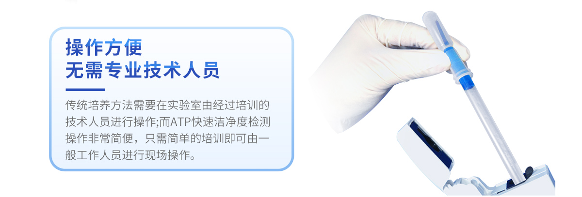 可操作性 —— 傳統(tǒng)培養(yǎng)方法需要在實(shí)驗(yàn)室由經(jīng)過培訓(xùn)的技術(shù)人員進(jìn)行操作;而ATP快速潔凈度檢測操作非常簡便,只需簡單的培訓(xùn)即可由一般工作人員進(jìn)行現(xiàn)場操作。