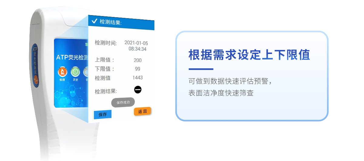 實(shí)用性 —— 可根據(jù)環(huán)境檢測需求設(shè)定上下限值,做到數(shù)據(jù)快速評估預(yù)警,表面潔凈度快速篩查。