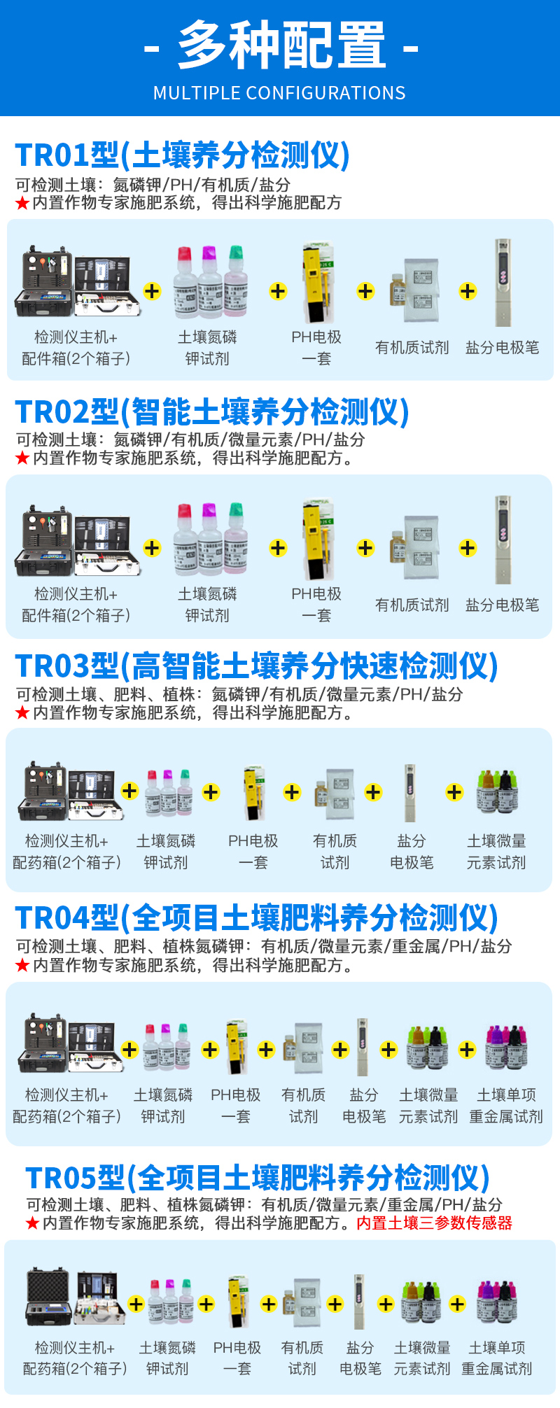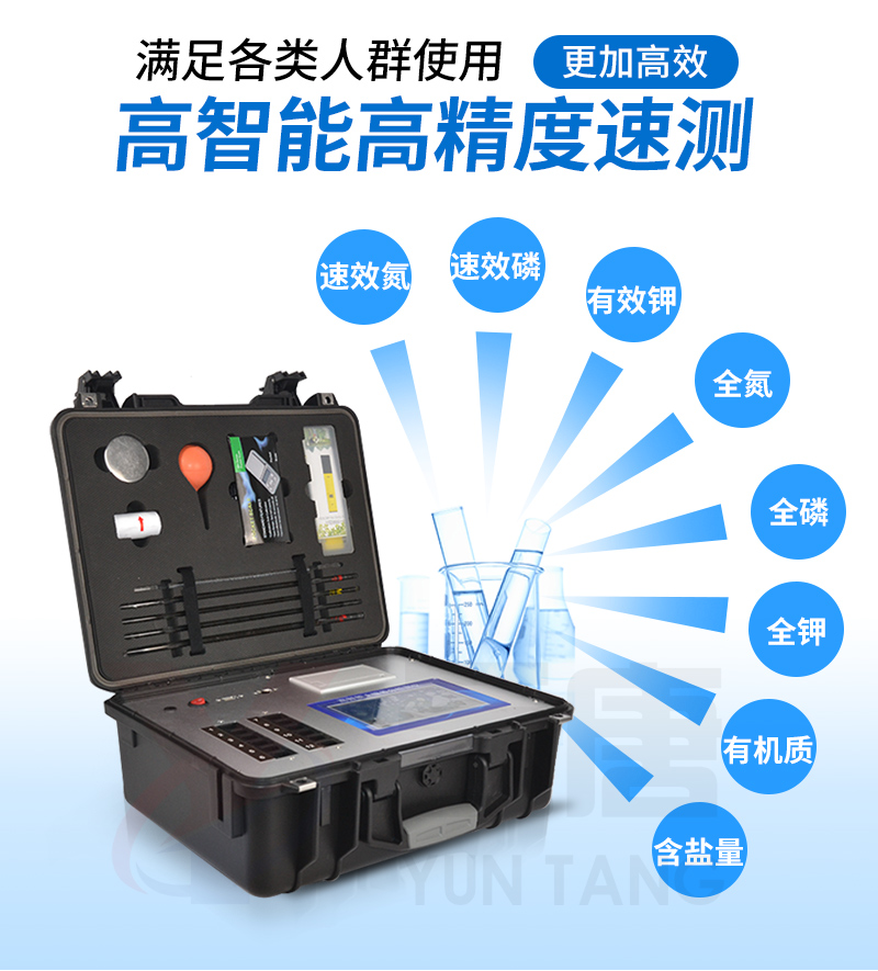 配套齊全:該儀器集藥、器、儀為一體,攜帶方便,相當(dāng)于一個小型移動實驗室,無需用戶自配附件,亦可靈活野外流動測試。適于農(nóng)業(yè)服務(wù)部門或農(nóng)資經(jīng)銷商、高教院校、科研院所、合作社、肥料廠商、大種植戶測土施肥和鑒別肥料真假及環(huán)保檢測應(yīng)用。