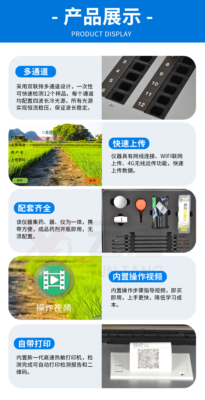 18、內(nèi)置新一代高速熱敏打印機(無需色帶),打印內(nèi)容包含:檢測單位、檢測人員、檢測項目、通道號、吸光度、養(yǎng)分含量(mg/kg)、檢測時間、以及二維碼等信息