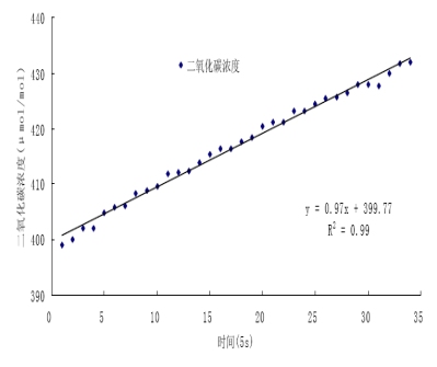 圖a RR-7330 測量系統(tǒng)測量閉路箱內(nèi)CO2累積過程及線性關(guān)系(中國農(nóng)業(yè)大學,韓廣魯,2010)