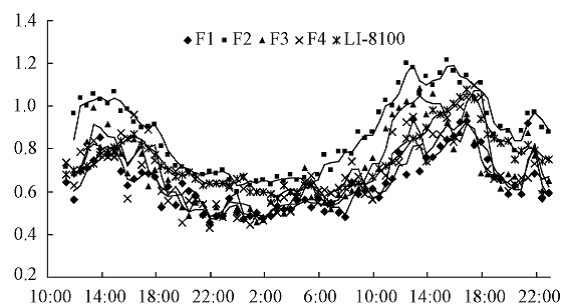 圖b RR-7330測量系統(tǒng)四個通道測量的土壤呼吸與li-8100測量日變化對比(中國林科院,高峻,2011)