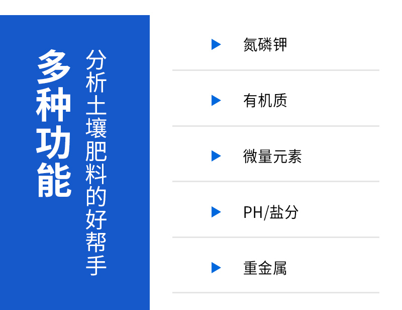 4、可檢測土壤及化肥、有機(jī)肥、植株中的速效氮、有效磷、速效鉀、全氮、全磷、全鉀、有機(jī)質(zhì)含量,土壤酸堿度,含鹽量(擴(kuò)展)。