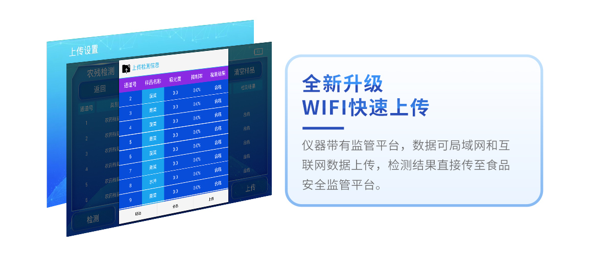 3、儀器帶有監(jiān)管平臺,數(shù)據(jù)可局域網(wǎng)和互聯(lián)網(wǎng)數(shù)據(jù)上傳,檢測結(jié)果直接傳至食品安全監(jiān)管平臺。進(jìn)行區(qū)域食品安全監(jiān)管及大數(shù)據(jù)分析處理與數(shù)據(jù)統(tǒng)計,檢測區(qū)域食品安全長短期動態(tài),達(dá)到食品安全問題預(yù)估、預(yù)警 。