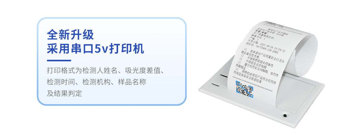 ①采用串口5v打印機(jī),可選擇手動打印或者自動打印,三分鐘出打印結(jié)果,打印格式為檢測人姓名、吸光度差值、檢測時間、檢測機(jī)構(gòu)、樣品名稱及結(jié)果判定。