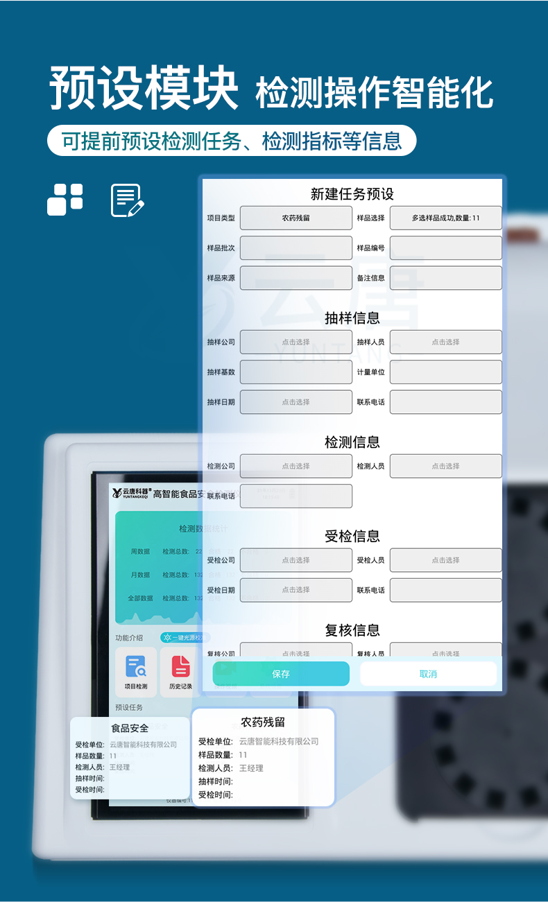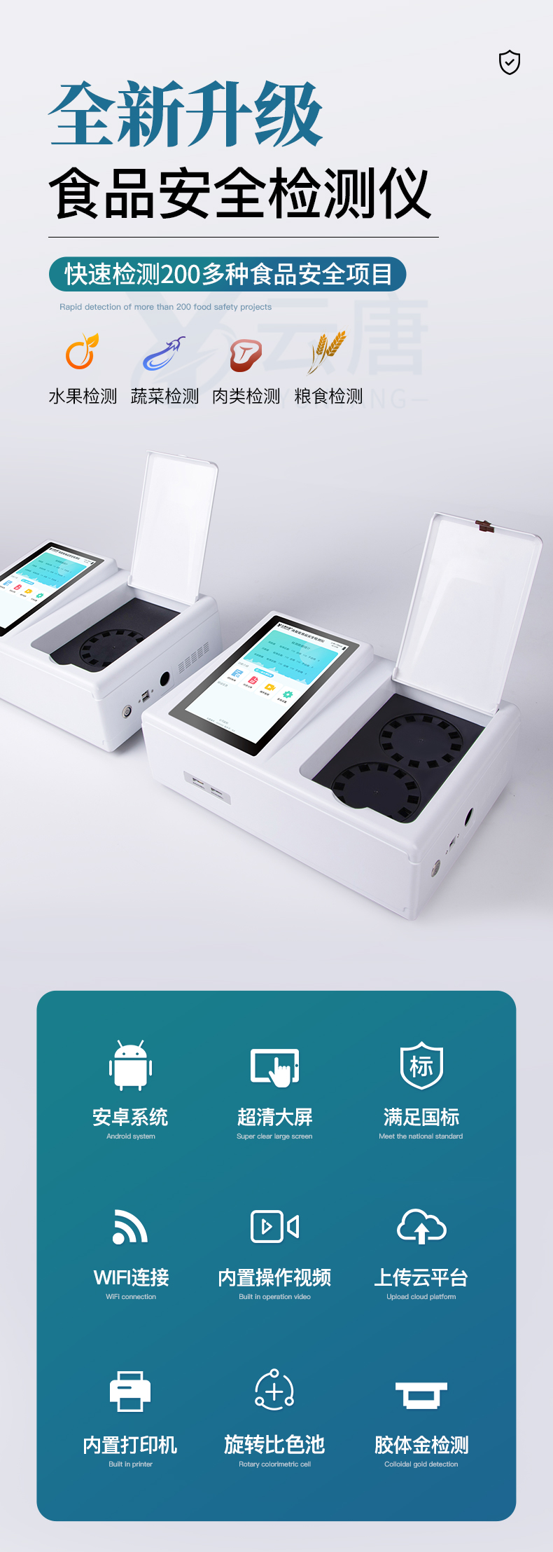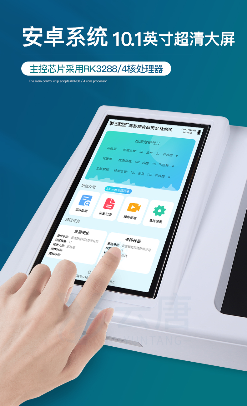 山東云唐智能科技有限公司生產(chǎn)的高智能食品安全檢測(cè)儀為集成化食品安全快速檢測(cè)分析設(shè)備,采用臺(tái)式一體化設(shè)計(jì),可快速檢測(cè)200多種食品安全項(xiàng)目,包含非食用化學(xué)物質(zhì)、濫用食品添加劑、農(nóng)藥殘留、獸藥殘留、重金屬、病害肉、營(yíng)養(yǎng)強(qiáng)化劑、抗生素類殘留、激素類殘留、真菌毒素類殘留、化學(xué)類殘留等項(xiàng)目的定性定量檢測(cè)。