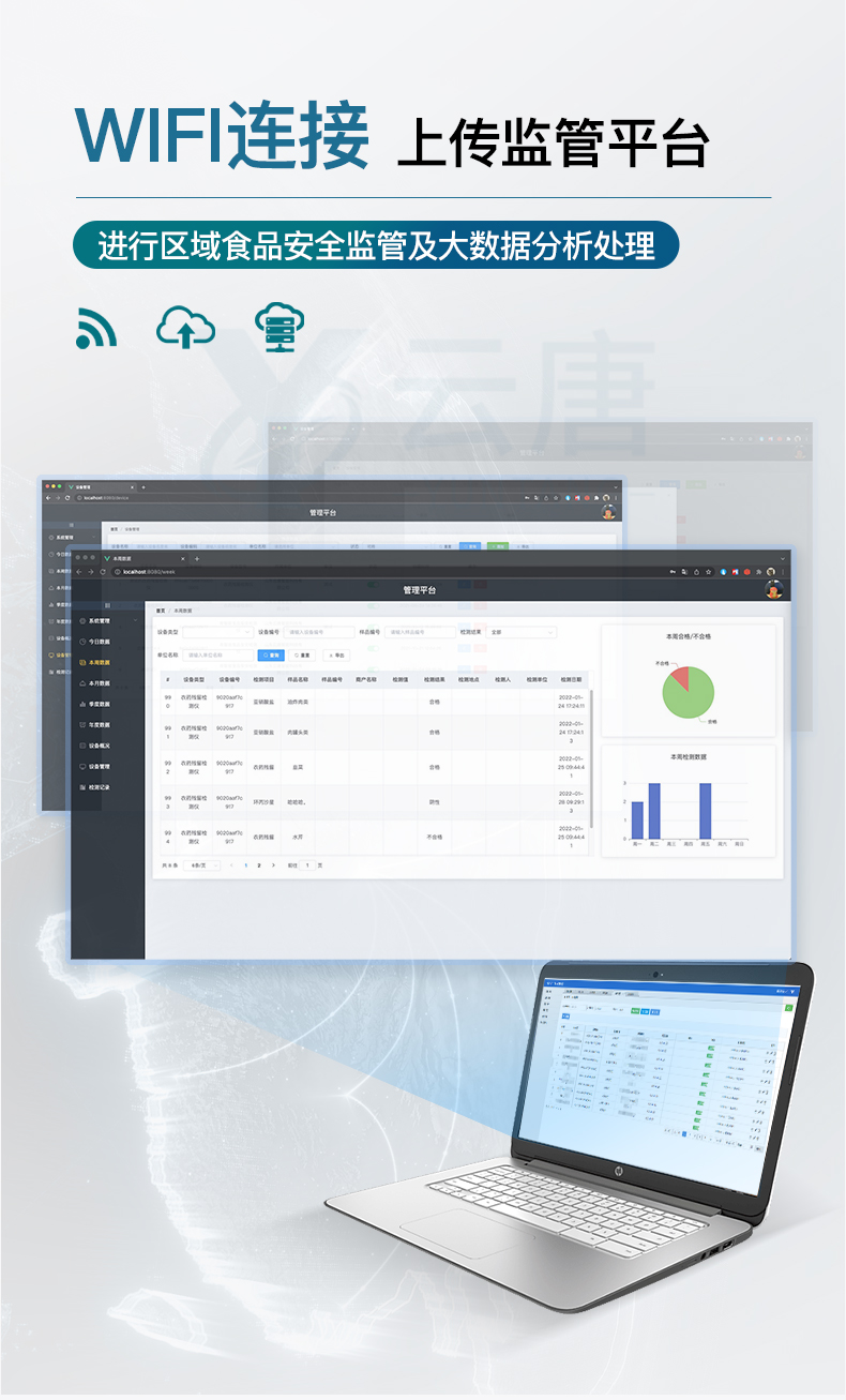 ★數(shù)據(jù)監(jiān)管系統(tǒng):同步對(duì)接監(jiān)管平臺(tái),數(shù)據(jù)可局域網(wǎng)和互聯(lián)網(wǎng)數(shù)據(jù)上傳,檢測(cè)結(jié)果可選擇直接傳至食品安全監(jiān)管平臺(tái)。進(jìn)行區(qū)域食品安全監(jiān)管及大數(shù)據(jù)分析處理與數(shù)據(jù)統(tǒng)計(jì),檢測(cè)區(qū)域食品安全長(zhǎng)短期動(dòng)態(tài),達(dá)到食品安全問(wèn)題預(yù)估、預(yù)警。(需提供對(duì)應(yīng)食品理化分析系統(tǒng)計(jì)算機(jī)軟件著作權(quán))。