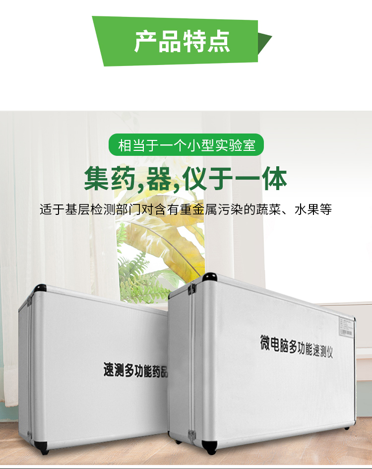 兩個(gè)鋁合金箱體,易于攜帶,便于現(xiàn)場(chǎng)測(cè)試,流動(dòng)服務(wù)。適于基層檢測(cè)部門對(duì)含有重金屬污染的蔬菜、水果等食品進(jìn)行篩選。